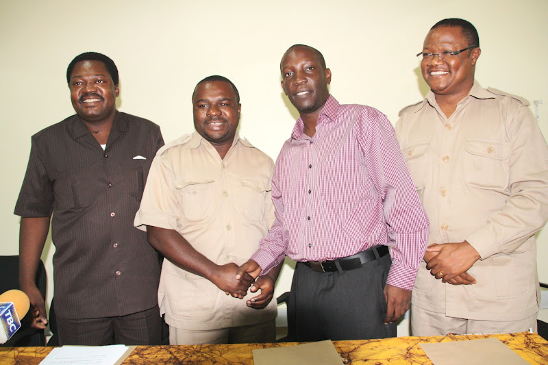 | Mbunge wa Mbeya Mjini Joseph Mbilinyi na Mkurugenzi wa Clouds Media Rugemalila Mutahaba wakipeana mikono jijini Dar es Salaam Februari 21.12, ikiwa ni ishara ya kupatana na kumaliza kwa tofauti zao zilizotokana na sababu za kimuziki zilizodumu kwa muda wa miaka miwili. Huku wapatanisha wa mgogoro huo Waziri wa Habari, Vijana, Utamaduni na Michezo Dk. Emmanuel Nchimbi (kushoto) na Mbunge wa Singida Mashariki Tundu Lisu (kulia) wakishuhudia. Picha na Anna Nkinda - Maelezo |