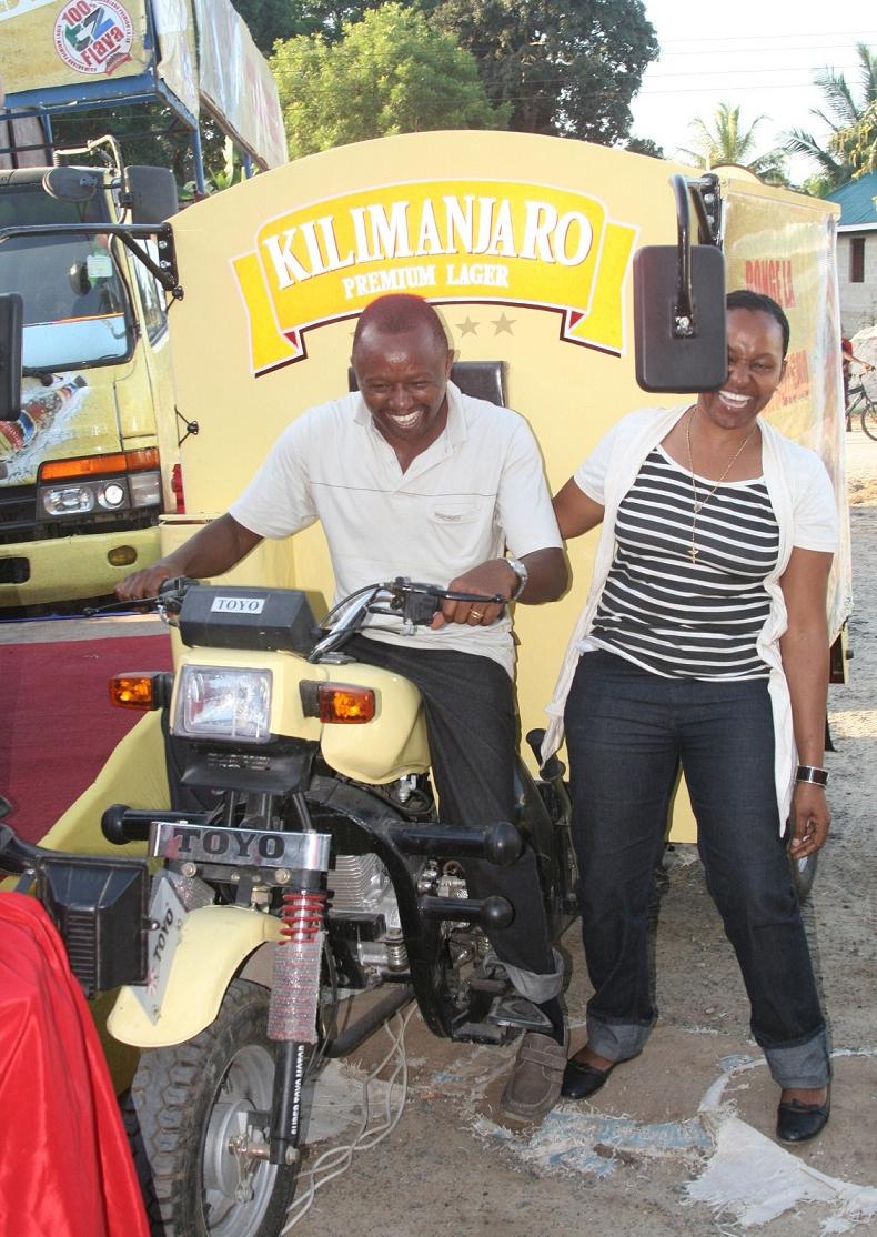 Mkurugenzi Mtendaji wa Kampuni ya Massawe Glosery, Jacob Massawe na mkewe Anna Massawe, wakifurahia zawadi ya Bajaj yenye thamani ya sh. mil. 4.7.