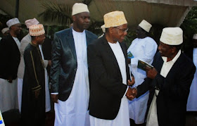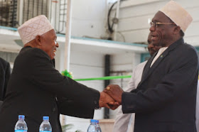 Waziri Mkuu Mizengo Pinda akimsalimia Mufti wa Tanzania, Sheikh Mkuu, Shaaban Issa Simba baada ya kuwasili ukumbini.